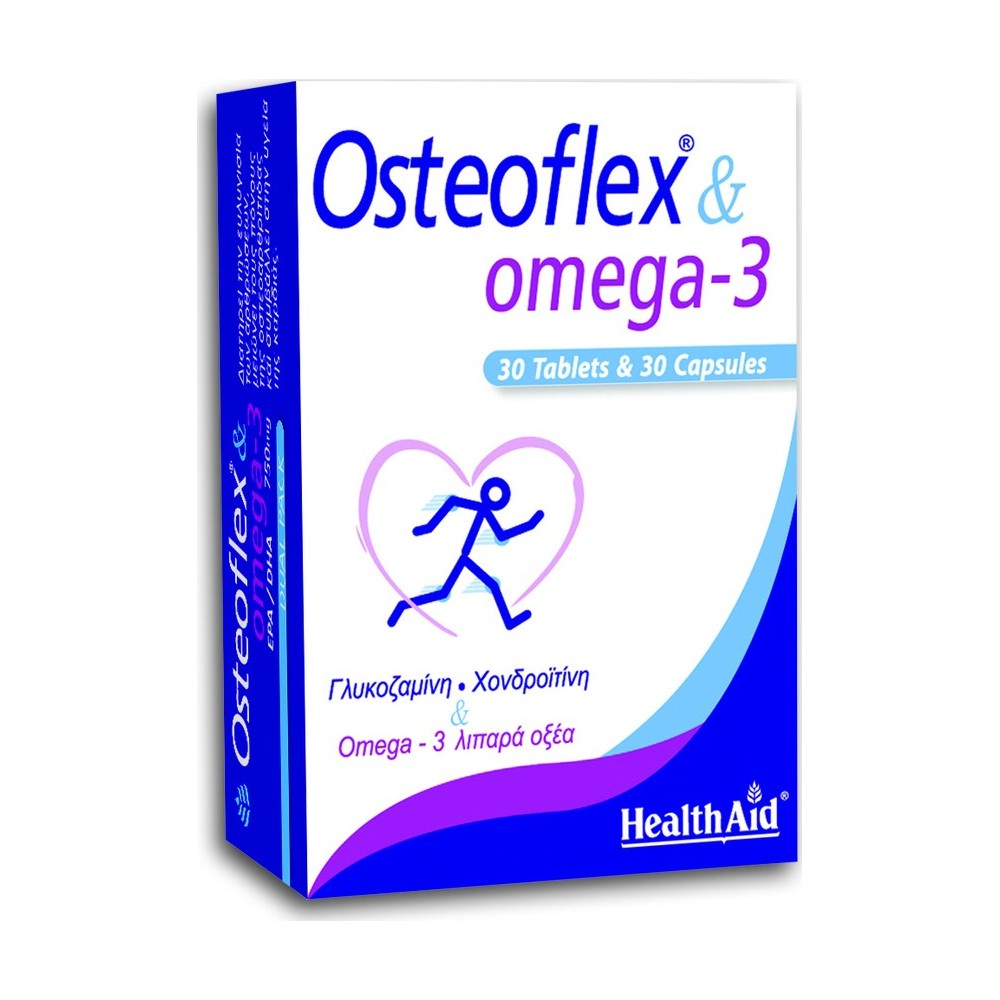 Το Osteoflex & οmega 3 της HealthAid είναι διπλός συνδυασμός με ταμπλέτες: Οsteoflex που περιέχει Γλυκοζαμίνη από οστρακοειδή, απαραίτητη γιατί βοηθά στην αναδόμηση του χόνδρου & στον σχηματισμό νέων συνδετικών ιστών γύρω από τις αρθρώσεις, Χονδροϊτίνη που εισάγει θρεπτικά συστατικά στον χόνδρο και διατηρεί την ελαστικότητα των τενόντων & των συνδετικών ιστών, Βιταμίνη C για την παραγωγή Κολλαγόνου, Κουρκουμίνη που έχει φυσικές αντιφλεγμονώδεις και αντιοξειδωτικές ιδιότητες & Μαγγάνιο για την σκελετική ανάπτυξη και κάψουλες με: Omega -3 (EPA 425mg / DHA 325mg) απαραίτητα λιπαρά οξέα, που βοηθούν στην καλή λειτουργία του κυκλοφορικού και της καρδιάς και η παράλληλη λήψη τους με το Osteoflex είναι ιδανική για την μείωση των φλεγμονών, της ακαμψίας & του πόνου της οστεοαρθρίτιδας. Η διπλή σύνθεση δρα συνεργιστικά για την υγεία των αρθρώσεων και των συνδέσμων, Για ευκίνητες αρθρώσεις ανακουφίζει από τους πόνους και βελτιώνει την υγεία της καρδιάς.